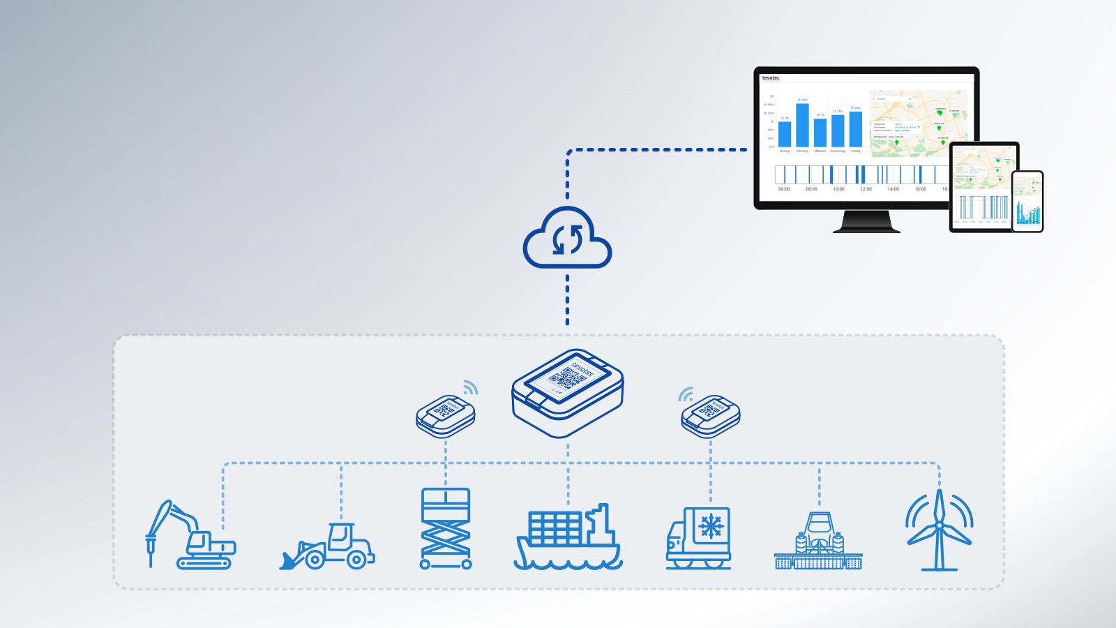 Das Tevotec IoT Asset Tracker System bietet eine flexible Erweiterbarkeit mit intelligenten, drahtlosen Sensoren. Damit kann eine breite Palette von Betriebs- und Auslastungsszenarien erfasst und ausgewertet werden. So stehen Auslastungsprofile sowie die Informationen, welche Maschinen im Einsatz sind, direkt zur Verfügung. Damit kann festgestellt werden, ob das Equipment optimal genutzt wird. Ebenfalls kann festgestellt werden, wann die nächste Wartung fällig ist. Automatische Mitteilungen darüber können konfiguriert werden.